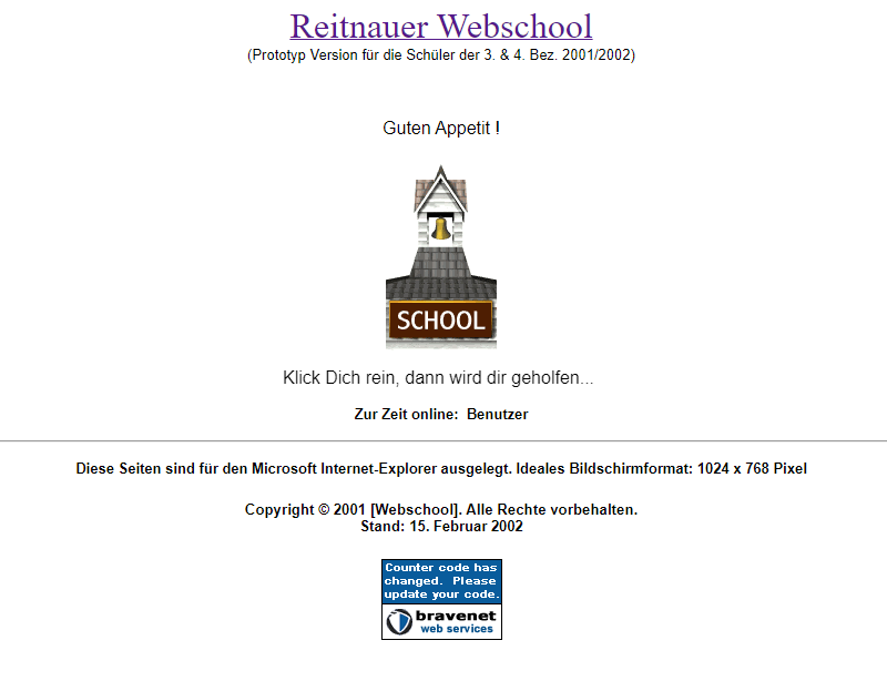 Hier eine der frühesten Startseiten der webschool.ch, Stand der Webschool am 2002/02 .